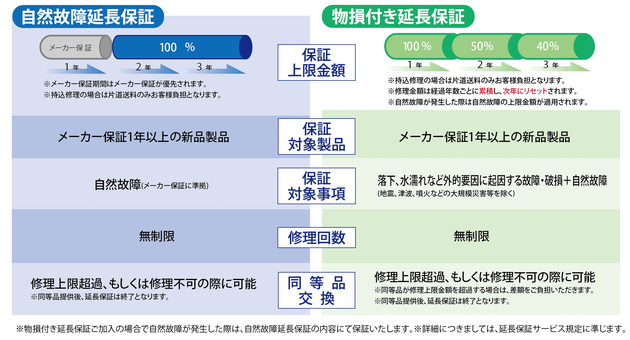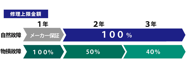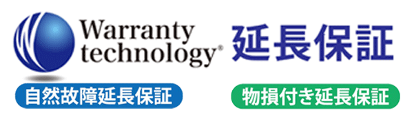 当店では自然故障のみを保証する「自然故障延長保証」と、自然故障に加えて「落下・水濡れ」等のリスクにも対応するさらに安心のプラン「物損付き延長保証」をご用意しております。
